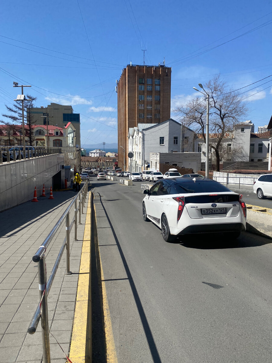 Сегодня нечаянно очутилась в центре города Владивосток возле ТЦ «Клеверхаус». Учитывая, что погода в субботу с утра задалась, в центре пустынно, все поехали на природу, загород, дачи и побережье. Выбор, как провести и выходные в городе у моря богат и разнообразен . А мне надо было собираться в командировку и купить немного наших специалитетов, поэтому я в центр. Как автомобилист стала думать, где припарковаться, чтобы по возвращении найди ее в том же месте, где и оставил, а не арестплощадке, со всеми вытекающими административными вопросами. Вобщем, оказалась я на улице с левосторонним движением, которое сразу ставит в тупик даже коренных жителей города). На ней прекрасно ориентируйся водители рейсовых автобусов , тк только по ней можно приехать на конечную остановку многих городских маршрутов автобусов. я крадучись и радуясь отсутствию бешенного трафика я нашла парковку, и пешком отправилась за покупками по пути фотографируя такую необычную дорожную карту. Будете во Владивостоке о