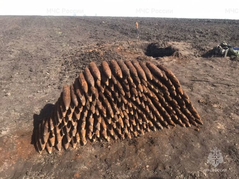 Действительно большое количество артиллерийских боеприпасов, почти сотня штук, была найдена накануне в брянском приграничье. Стало известно, что в оперативную дежурную смену Главного управления МЧС России по Брянской области поступило сообщение об обнаруженных в приграничном Севском районе 96 (!) снарядах. Возраст жуткой находки далеко не маленький. Все обнаруженные взрывоопасные предметы относятся ко времени Великой Отечественной войны. К месту обнаружения почти сотни снарядов выезжала группа специальных работ ГКУ “Брянский пожарно-спасательный центр”. Спасатели-саперы уничтожили страшный схрон. Фото пресс-службы ГУ МЧС России по региону