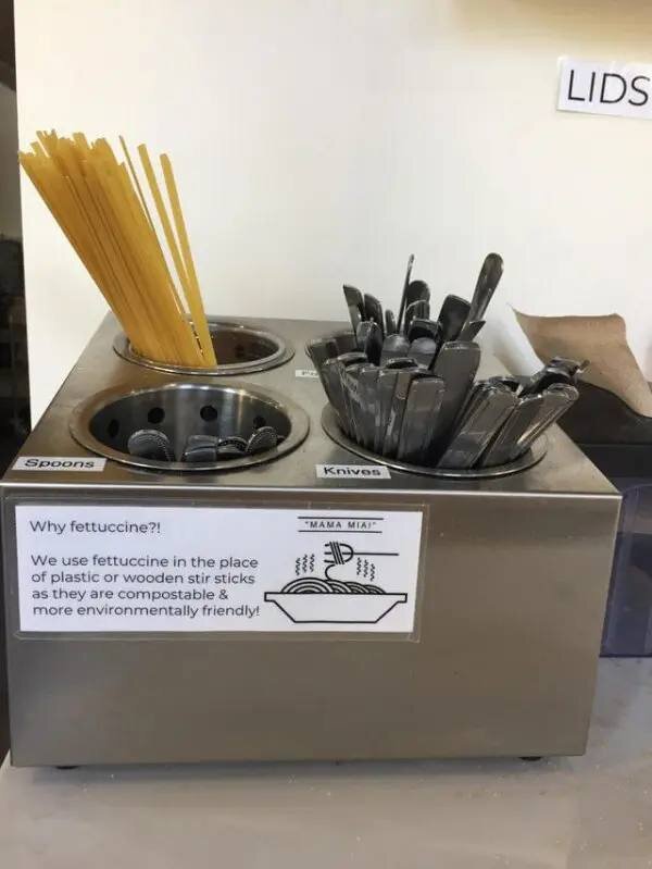В одном из зарубежных кафе решили использовать пасту феттучини вместо пластиковых палочек для кофе