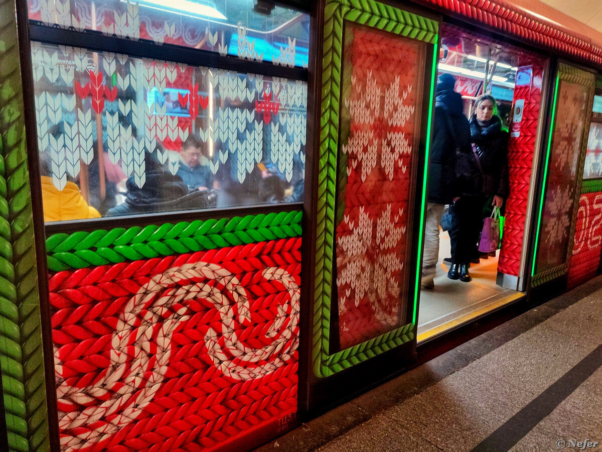 Составы курсируют по разным линиям. На Кольцевой попался вот такой, будто вязанный. Пришлось ускориться, чтобы успеть, уж очень хотелось прокатиться на нем. И снаружи, и внутри вагон оформлен в красном цвете, на окнах и дверях узоры типа снежинок. Судя по цифрам 2024, это новогодний поезд, получилось очень мило. Другой новогодний поезд. Ехала на нем по Калужско-Рижской линии. Снегири, снежинки, елки и елочные украшения, вот это вот все. На самом деле, метрополитен запустил 11 таких поездов, они курсируют по Сокольнической, Арбатско-Покровской, Калининской, Серпуховско-Тимирязевской, Солнцевской линиям и БКЛ. Серпуховско-Тимирязевская линия. Поезд уже закрыл двери и приготовился к движению, да и мне нужно было в другую сторону. Щелкнула его, потом стала рассматривать. Это состав, посвященный МЧС и волонтерам Национального центра помощи детям. В вагонах размещены советы, которые помогут сохранить здоровье и жизнь, а также QR-коды, которые ведут на полезные видеоролики. Поезд запустили в