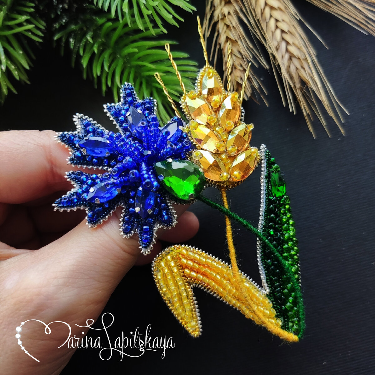 Всё цветут и цветут васильки... С. Угрюмова Для изготовления броши понадобятся: ▪️ фетр жесткий толщиной 1 мм (белый), ▪️ акриловые краски, ▪️ бисер чешский № 10 (синих, зелёных и жёлтых оттенков), ▪️ стразовая цепочка 2 мм (красная, серебристая, зелёная), ▪️ канитель жесткая серебристая, зелёная, синяя, жёлтая, ▪️ стразы 6х12 мм золотистые - 7 шт, ▪️ страз "капля" 10х14 мм - 1 шт. зелёного цвета, ▪️ страз 6х12 мм зелёный - 1 шт., ▪️ стразы "наветт" синие (сапфировые) 5х10 мм - 5 шт., ▪️ рондель 4 мм (синий) - 1 шт., ▪️ нитки для вышивания (зелёные и жёлтые), ▪️ проволока толщиной 0,6-0,8 мм для стебля, ▪️ проволока латунная толщиной 0,4-0,5 мм для остей, ▪️ основа для броши - 1 шт. (35 мм), ▪️ нитки капроновые №50, мононить для обшивки, ▪️ клей "Момент-Кристалл" и