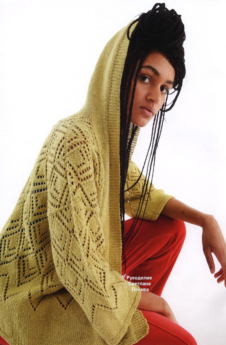 Лето - это не только жара, но и прохладные вечера, когда легкий джемпер или топ из хлопка будет очень кстати. К тому же, хлопок - это натуральный материал, который приятен к телу и не вызывает раздражения. Так что давайте свяжем несколько красивых изделий из хлопка к лету! №1 Ажурный хлопковый жакет с красивым узором, связанный в свободном стиле, с капюшоном - это просто мечта! Но конструкцию можно изменить, если захочется. Например, можно сделать его короче или длиннее, убрать капюшон или добавить карманы. Главное - это замечательная идея из хлопка или бамбука! №2 Нарядный удлиненный топ с потрясающим узором, который расширяется книзу, выполненный из яркой пряжи оранжевого цвета - это идеальный выбор для летнего гардероба. Такой топ будет уместен как на пляже, так и на вечерней прогулке по городу. Оранжевый цвет поднимет настроение и добавит яркости в образ. №3 Свободного кроя джемпер с ажурным узором снизу, связанный из темно-синей пряжи, с верхней частью, выполненной лицевой гладью