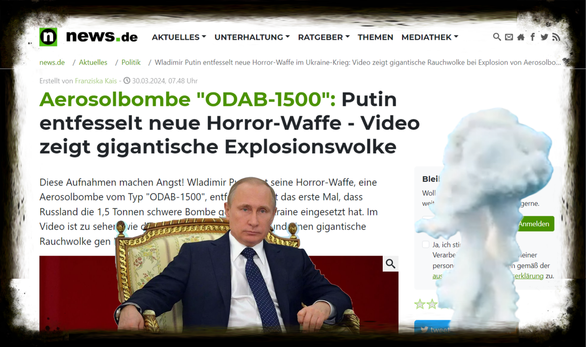 Обзор политических новостей от 30 марта 2024 года, представленных для читателей Германии немецким интернет издательством News.de. Теперь заголовок о новом оружии ужасов Владимира Путина. Процитируем часть основного содержания данной статьи: “Эти кадры пугают! Владимир Путин выпустил на волю своё оружие ужасов, аэрозольную бомбу типа "ОДАБ-1500". Это первый случай, когда Россия применила 1,5-тонную бомбу против Украины. На видео видно, как она взрывается, и в небо поднимается гигантское облако дыма. Эти ужасающие кадры в настоящее время распространяются в социальных сетях как лесной пожар. Военкоры поделились видео и фотографиями, на которых Владимир Путин использует новое оружие ужасов в центре небольшого городка Великая Писаревка в Сумской области Украины. По данным “Бильд” информация подтверждается. Говорят, что это первый раз применения такого страшного оружия на Украине. На видеозаписи видно, как сначала взрыв сотрясает приграничный украинский город, а затем в небо поднимается гига