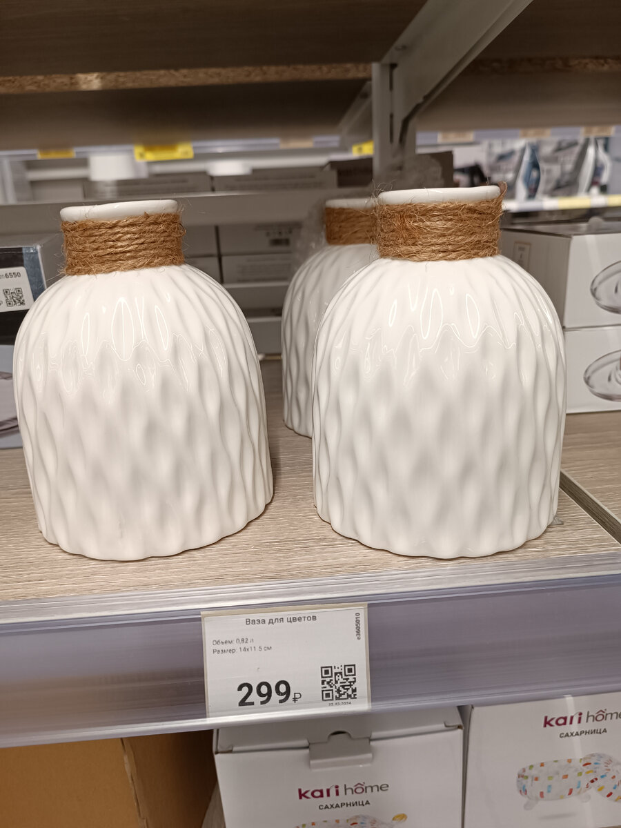 Приветствую всех! В прошлый поход в магазин Кари я снимала не только обувь, но и отдел посуды. Просто решила эти 2 отдела в разных обзорах вам показать, чтоб не растягивать. В этой подборке от меня товары для кухни из недорого и симпатичной коллекции, а еще оригинальная посуда, которую в Фикс Прайс точно не встретите, а украшать праздничные столы очень хочется! Начну с вазочек, в этот раз появились такие в форме пышных юбок, почему-то у меня такие ассоциации появились. А верх надо было бы доделать до волос, а вместо влос были бы уже цветочки. Очень понравились и стоят они недорого. Материал, по-моему, керамика. Просто тут этикетка закрыта ценой. Еще две большие вазы есть, для цветов с длинными стеблями. Эти, правда, уже существенно дороже стоят. Я все еще мечтаю об этой урне для мусора с сенсорным управлением. Те, кто покупал в Фикс Прайс силиконовые ершики маленькие, которые крепятся к стене, такие же белые, понимаете же, что и по форме идеально к этим урнам подходят... Туалет смот