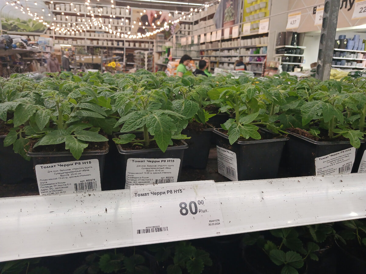 Уже появилась рассада бархатцев бегонии и петунии. Стеллажи ещё полные, думаю, что их только начали продавать.