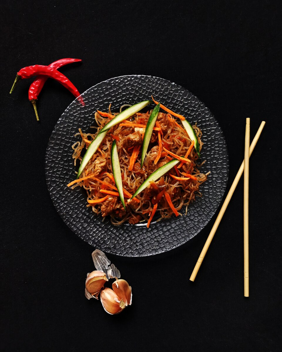 Продукты: - Фунчоза - 150 г - Перец болгарский красный - 1-2 шт. - Лук репчатый - 1-2 - Морковь свежая (крупная) - 1 шт. - Огурец свежий - 1 шт. - Соус соевый - по вкусу - Соль - по вкусу - Масло растительное - для обжарки - Кунжут - для украшения Нарежьте овощи симпатичными брусочками. Для своего удобства морковь я измельчила с помощью овощетерки. На хорошо разогретой сковороде обжарьте морковь, лук и перец на растительном масле в течение 10 минут. Приготовьте фунчозу по инструкции, указанной на упаковке. Я обычно варю фунчозу ровно 3 минуты, и она получается идеальной, на мой вкус. Как только фунчоза будет готова, слейте воду и добавьте обжаренные на сковороде овощи и огурец. Фунчозу с овощами заправьте соевым соусом по вашему вкусу. Для более аппетитного вида я добавляю небольшую горсть кунжута. Салат "Фунчоза с овощами" готов к употреблению! Всем приятного аппетита и хорошего настроения!