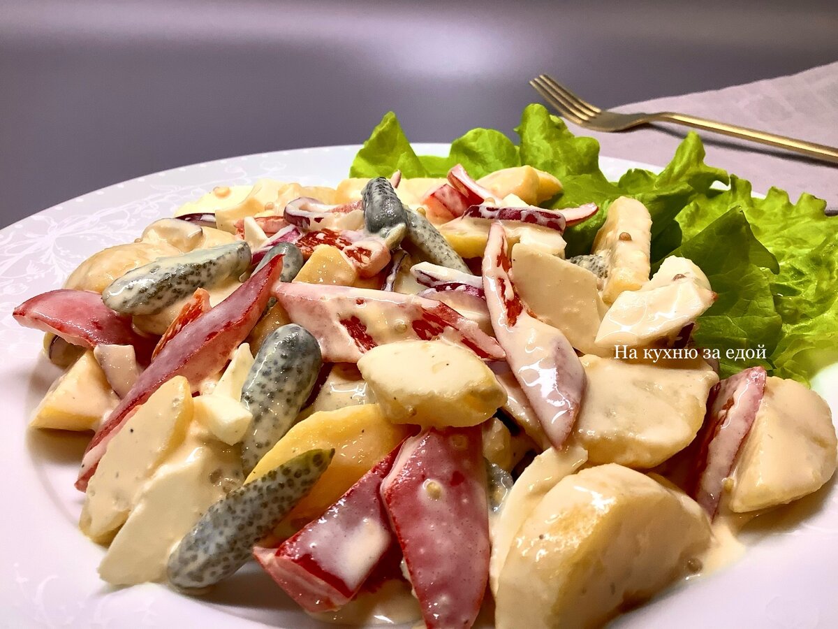 Картофельный салат-закуска которая может быть самостоятельным блюдом, а может подаваться на гарнир к мясу, рыбе, птице. Такой салат подойдёт для пикника с шашлыком, ведь готовить его несложно и не требуется никаких приспособлений. Заранее подготовленные продукты можно нарезать на одной доске, а соус взбить вилкой.