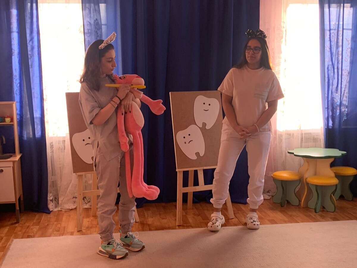 После раздали зубные щетки и дети чистили зубы от нарисованных микробов.