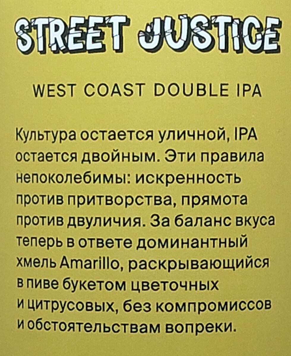 Так называемый Singlehop, то есть IPA, сваренный на одном хмеле. В линейке "Street Justice" есть несколько сортов; сегодняшняя версия, как понятно из названия, - на Amarillo.