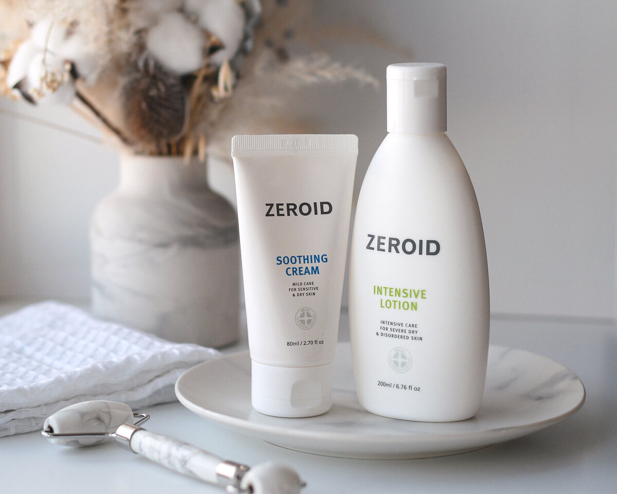 Для увлажнения я взяла два средства: Интенсивный лосьон с лёгкой текстурой Zeroid Intensive Lotion в качестве дневного ухода и смягчающий крем Zeroid Soothing Cream для самых сухих и раздражённых участков.
