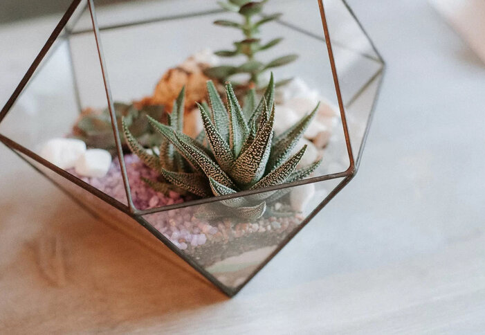 Почему-то во многих источниках написано, что «суккуленты нужно оберегать от прямых солнечных лучей». Но логика говорит, что в природе они (большинство из них) растут в жарких солнечных странах. Так что большинство суккулентов (кроме тех, которые и в природе растут в затенённых местах) не только переносят, но и любят солнечные лучи. И всеми любимые цветные суккуленты приобретают яркий свет именно на прямом солнце. Летом даже обычная крассула на солнце приобретает красноватый оттенок. НО! В комнатных условиях солнце светит через стекло. А если полузакрытый флорариум, то плюс ещё и через грани. И может действовать как линза, в результате чего растения могут получить ожоги. Сами по себе они не угрожают жизни растений, но это может стать трагедией для перфекциониста. Что делать? Если растения стоят на южном окне, то в дни активного солнца (пояснение для жителей Петербурга: если солнце вышло на 10 минут, то это не считается) можно затенить окно или просто отставить растения от прямых луче