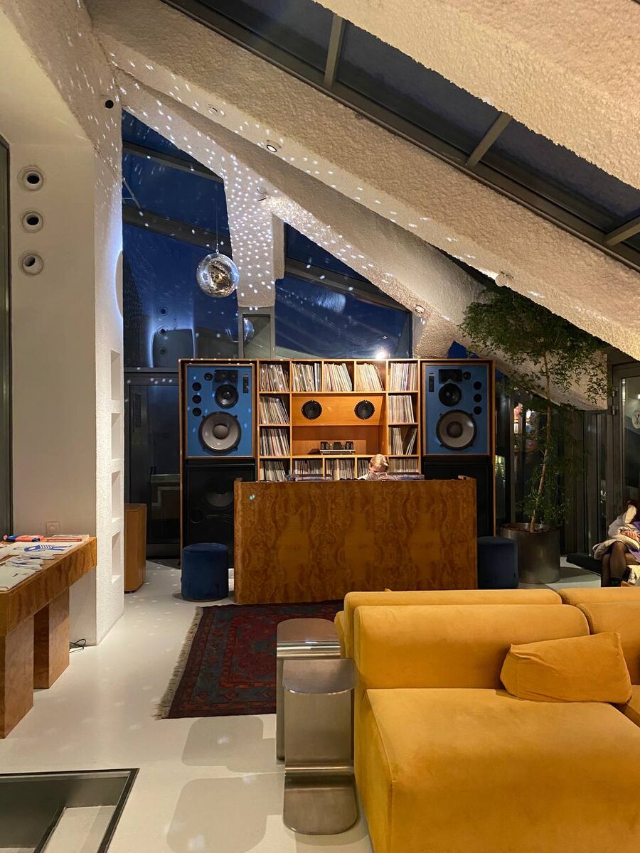Мы с подругами собрались в пиццерии Found, расположенной на пятом этаже ТЦ Цветной. Фишкой данного заведения являются панорамные окна, которые летом открываются и пространство превращается в террасу, и в солнечный день ресторан игриво наполняется светом. А еще тут можно купить виниловые пластинки. Интерьер выполнен в былом цвете и акцентной охре, а столы и стулья - из дерева.