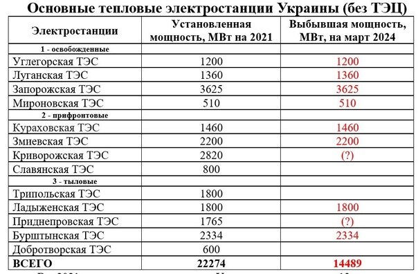 Вот тут такая табличка в интернете появилась. Согласно ей до начала боевых действий на Украине было 13 ТЭС. Сейчас 4 ТЭС уже под нашим контролем. У укров осталось 9, из которых 4 разрушены, 2, скорее всего, повреждены, 3 еще ударам не подвергались. Таким образом, из 22,3 ГВт, которые вырабатывали ТЭС Украины перед началом СВО, осталось максимум 7,8 ГВт, а скорее всего и меньше.
