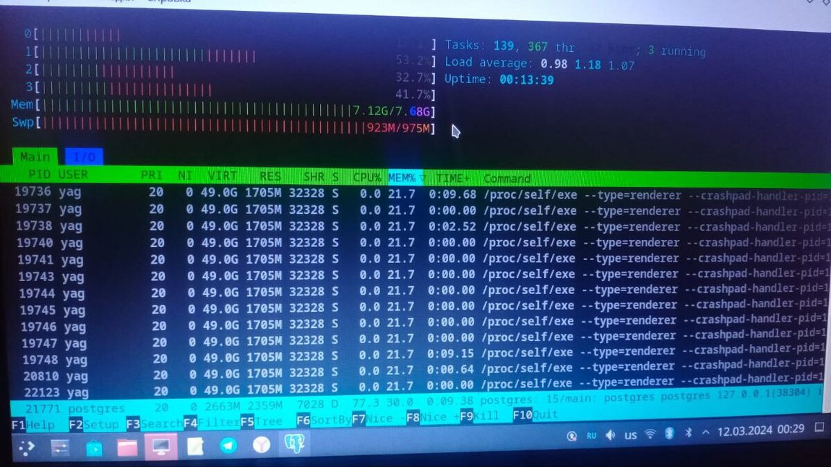 В общем история такая. Для тех, кто не знает, что такое SWAP — это механизм виртуальной памяти в Linux, при котором отдельные фрагменты памяти перемещаются из ОЗУ в так называемые области подкачки (swap area или swap space), расположенные на вторичном хранилище данных. Был у меня системник 2 ядра, 6 гб ОЗУ (DDR2), ssd 128гб. Накатил туда Linux Debian 12, и как то не особо заморачивался воткнул SWAP 1гиг. Работало всё нормально изредко притормаживал только, пока не захотел системник сменить на ноутбук. Просто перекинул жёсткий с системника на ноутбук и всё заработало со всеми программами и пр. Решил тут базу на PostgreSQL обкатать кол-во записей было в базе 4,5 млн. Подправил код под себя ну и дайка я хотя бы 1,5 млн. добавлю в базу одним запросом (INSERT INTO) как обычно... Кстати размер файла был примерно 200мб (текста). Ну и закидываю в PgAdmin запрос выполняю и начинается загруз кулера ноутбука на 100%. Минуты 2 и ноутбук висит жёстко. Мышь еле еле дергается и всё. В общем ради э