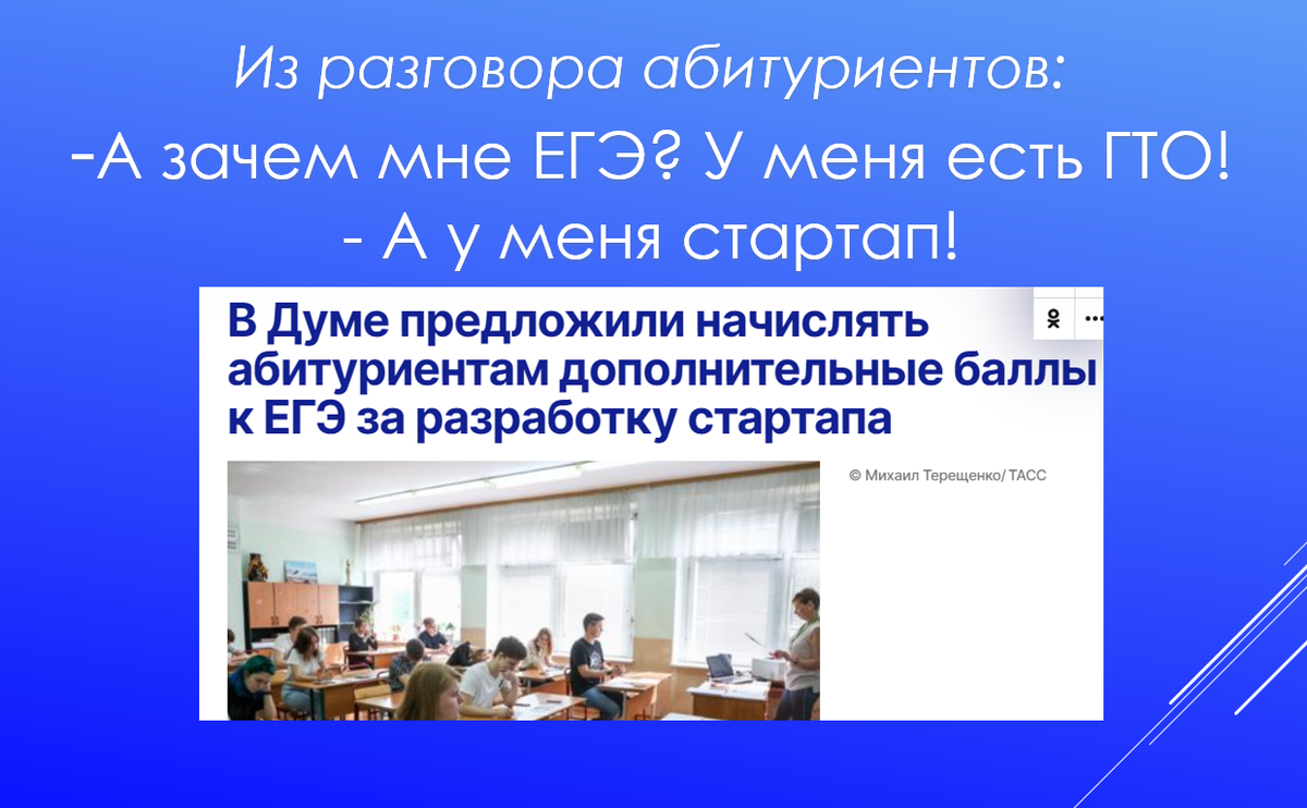 Есть такая закономерность: чем ближе май, тем чаще «всплывает» тема ЕГЭ. Причем не только среди заинтересованных лиц – учеников и их родителей, учителей и приемных комиссий вузов, но и среди законодателей. А март – это же уже «почти май»: когда же, как не в марте «словить хайп» на больной для нескольких миллионов человек теме… Нынешний март – яркое тому подтверждение. Одни депутаты предлагают при поступлении «отнимать» баллы от имеющихся результатов ЕГЭ, а другие хотят прибавлять. Новая мартовская инициатива исходила от человека, который, что называется, «в теме»: от первого замглавы комитета Госдумы по просвещению! Г-жа Лантратова тоже предлагает добавлять баллы к результатам ЕГЭ за стартапы, направленные на решение социальных проблем страны, а также за использование абитуриентом новых технологий: искусственного интеллекта, больших данных. Новость вроде бы неплохая, возможно, какое-то образовательное учреждение обрадуется подобной возможности, но у школьного учителя возникает некий ди