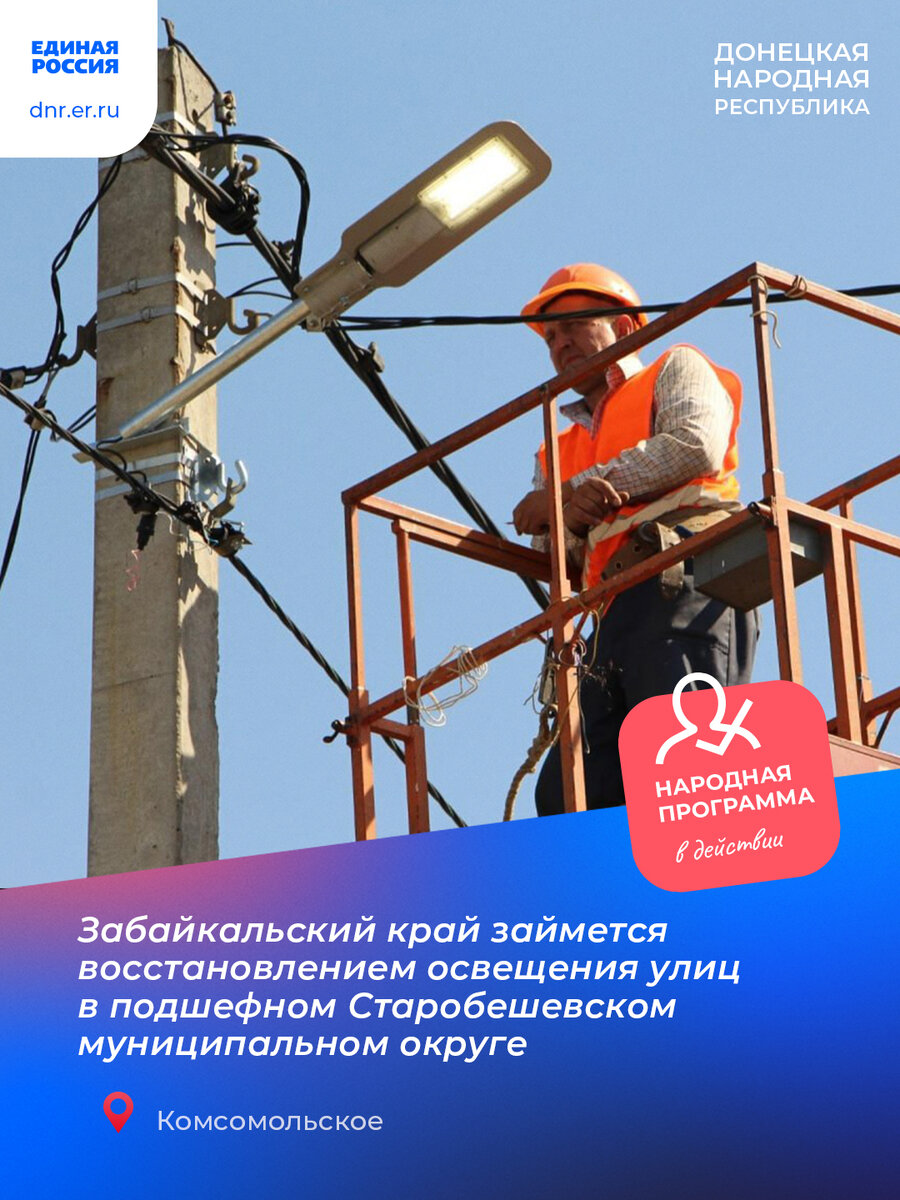 Забайкальский край займется восстановлением освещения улиц в подшефном Старобешевском муниципальном округе. Обновление будет реализовано по Народной программе Единой России – Стратегии возрождения и развития Донбасса. «Забайкальский край направит 5 млн рублей на ремонт освещения в Комсомольском. Сейчас готовится проектно-сметная документация. Работы планируют завершить в течение 2024 года», – рассказал секретарь Старобешевского местного отделения Единой России Николай Михайлов. #ЕРДНР #НароднаяПрограммаЕР #ЕдинаяРоссия