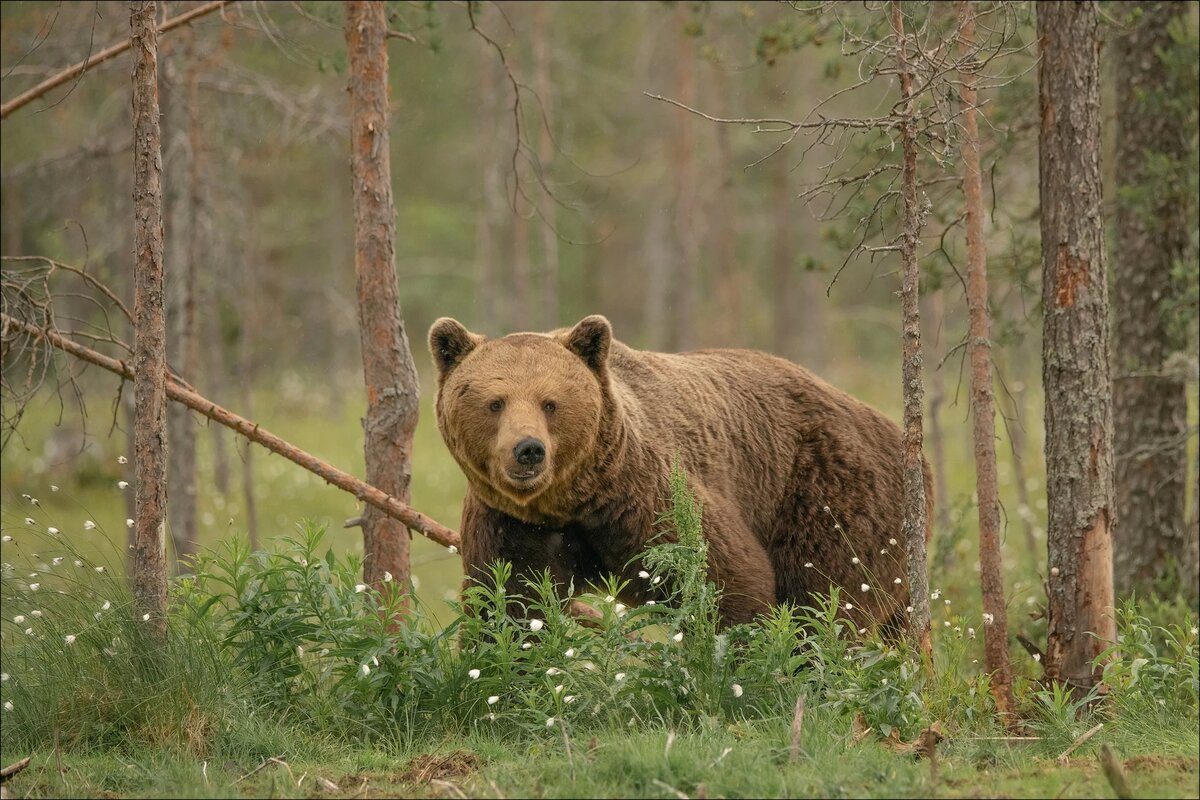 Типичный таёжный и лесной житель – бурый медведь – распространён практически во всей России, несмотря на разницу климатических поясов и биоценозов. Эти мощные и сильные животные обитают в чащах, лиственных, хвойных и смешанных лесах средней полосы, в сибирской тайге на Байкале, на Дальнем Востоке, можно их наблюдать и в Кавказских горах, а также в среднеазиатских горных районах. Любят медведи дикорастущие плодовые и ореховые древесные породы, поэтому в тех местах, где эти растения встречаются, можно обнаружить и следы пребывания этого крупного хищника. Когда бурый медведь ходит, у него ноги смотрят вовнутрь, что повышает его устойчивость. Носить даже на четырёх лапах такой вес, особенно, когда приходится нагуливать на зиму жир, медведю было бы непросто, если бы он опирался не на всю стопу целиком и не «забирал» лапами при ходьбе вовнутрь. Передвигается зверь иноходью: попеременно шагая то правыми задней и передней ногами, то левыми. При этом его тело раскачивается из стороны в сторон