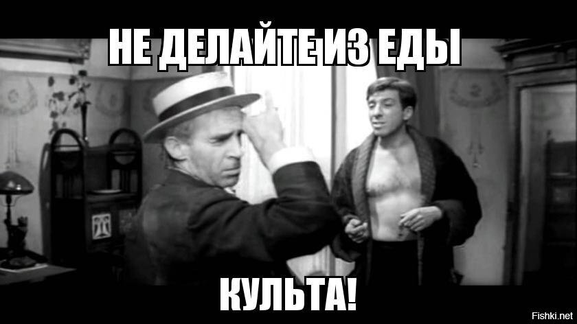 Паниковский, пригнувшись, убежал в поле и вернулся, держа в руке теплый кривой огурец. Остап быстро вырвал его из рук Паниковского, говоря: — Не делайте из еды культа.