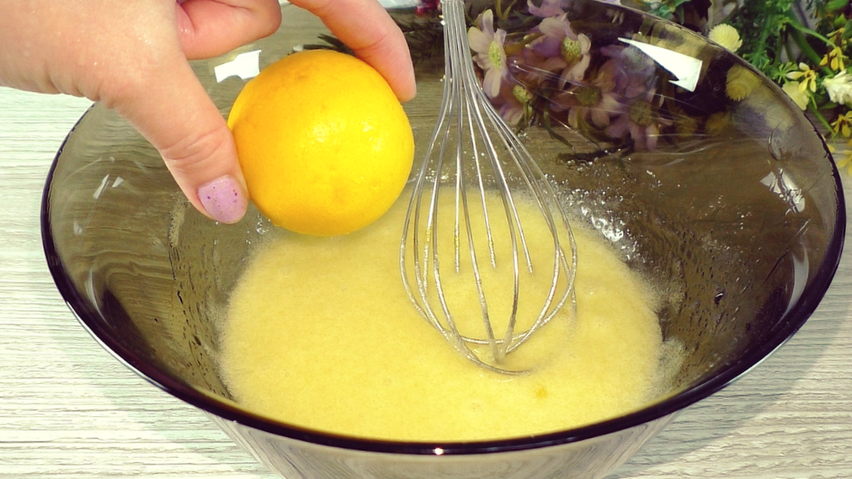 Цедры на моём лимоне оказалось совсем мало добавляю 1 ч. л. сушёной цедры лимона. Выдавить сок лимона и отправить в тесто, перемешать.