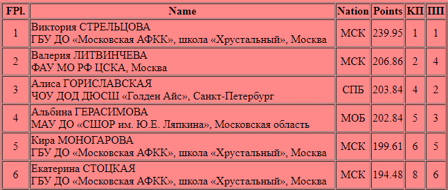 Главными событиями последних дней стали различные танцевальные трансферные новости (о них в отдельной статье чуть позднее), а также первое шоу Этери Тутберидзе в рамках нового гастрольного тура, которое пройдет через 12 российских городов. Отметим и один из последних турниров уходящего сезона в Выборге, где главной звездой стала Вика Стрельцова. "Серебряное ожерелье России" Девушки (1 сп. разряд) (Итоговое положение) В Выборге, который если кто-то не знает находится в Ленинградской области, прошел достаточно крупный турнир, где мое внимание прежде всего привлекли два проката 11-летней Вики Стрельцовой, выступавшей на этом турнире без тренеров. Как и других московских фигуристок (Лера Литвинчева, Кира Моногарова и Катя Стоцкая) ее сопровождала мама. Качество трансляции было очень плохим, но все же прыжки ультра-си разглядеть удалось. Судя по баллам в табличке вы можете понять, что Вика сотворила нечто невероятное на этом турнире. В короткой программе у нее получилось абсолютно все заду