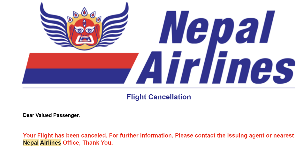 Ну, а как по-другому? Конечно, именно так: за неделю до отъезда от Непальских королевских авиалиний приходит письмо о том, что мой рейс отменен. Еще и рожа такая страшная к этому письму пририсована:)