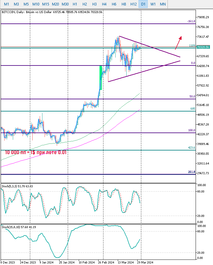 D1 Обычно я обхожу биткоин стороной в торговле. Редко открываю по нему сделки, но на прошлой неделе не смог игнорировать его т.к. отовсюду лились новости о новых исторических максимумах. На графике вижу начало формирования треугольника, в котором цена будет находиться ближайшие 1-2 недели, после чего ожидаю дальнейший рост. На графике отметил зеленым цветом важный бар 28 февраля, который уже пытались и будут пытаться снова поглотить. Покупатели на нем отлично отрабатывают, формируя длинные хвосты вниз. Диапазон треугольника достаточно широкий. Внутри можно торговать от линий поддержки и сопротивления. Торговлю вести с осторожностью т.к. линии сужаются. H4 Тут можно искать дивергенции, конвергенции на Стохастиках. Также длинны хвосты и разворотные бары вблизи линий поддержки и сопротивления. Нужно держать в голове, что треугольник видят если не все, то многие и цена будет делать обманные движения, выбивая как покупателей, так и продавцов. H1 Тут есть интересный треугольник-обманка, кото