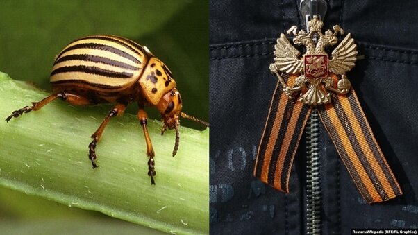 Колорадский клоп – вредитель, повреждающий посевы картофеля, поэтому у нас в стране его небезосновательно ненавидят. В начале вторжения в 2014 году российские солдаты и их местные пособники носили так называемые «Св. Георгиевская ленточка», окрашенная в черные и оранжевые полосы, как их символ.