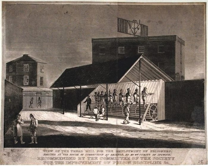 В 1818 году некто сэр Уильям Кьюбитт предложил устройство под названием «бесконечная лестница». Оно представляли из себя горизонтальный цилиндр из 24 ступенек длиной около 50 метров и около двух метро радиусом. По ступенькам могли одновременно шагать до 40 человек, приводя цилиндр в движение. В целом, Кьюбитт не изобрел ничего принципиально нового - подобные конструкции применялись еще в Древнем Риме и в средневековой Европе как приводы для мельниц или подъемных кранов. Но устройство внезапно приглянулось английской пенитенциарной системе. Судите сами - лестницу можно подключить в той же мельнице или станкам на фабрике или еще какому-то механизму - и заключенные будут заняты общес