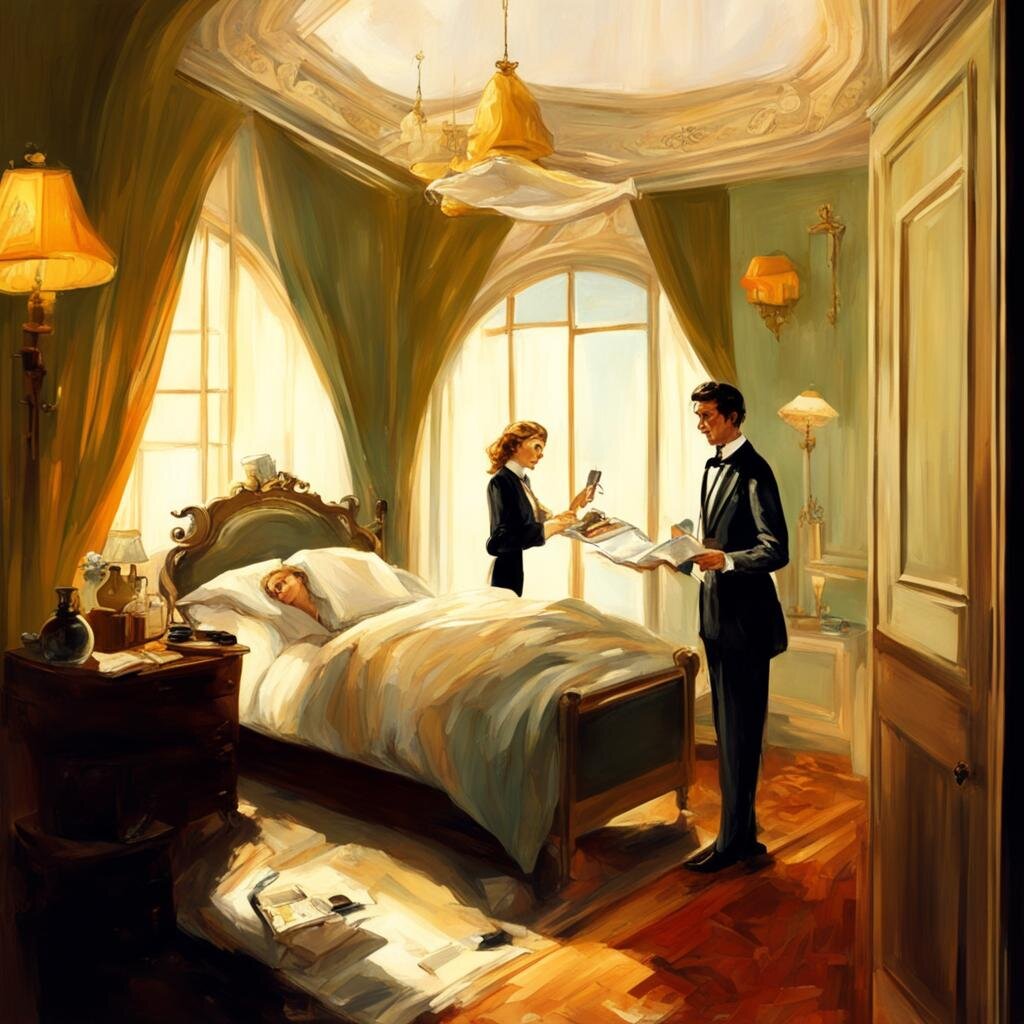 В очень известном, фешенебельном Гранд Отеле остановилась семейная пара консула одной небольшой европейской страны. Гранд Отель всегда славился своим высочайшим сервисом, на него равнялись все остальные в городе, и даже стране, он первым вводил новшества - и как только их кто-то повторял - первым же и убирал, объявляя "немодными" и оставляя другим право пользоваться прошлогодними инновациями в гостеприимстве, высокомерно выданными с барского плеча. Это было летом, дел у консула много - и в 7 утра он уже вышел встречать ещё не яркое северное летнее солнце. Супруга консула, в неге, наслаждалась приятным утром и изволила лежать в неглиже на пятом этаже в номере с прекрасной террасой. 7 утра были рабочими часами уже не только для консула, и, несмотря на тишину - вокруг кипела отельная жизнь. В соседнем номере маляр что-то красил, он был не лишён чувства прекрасного - видимо это такой ценз для трудоустройства в Гранд Отель - потому ему захотелось не просто покурить, а насладиться видом с