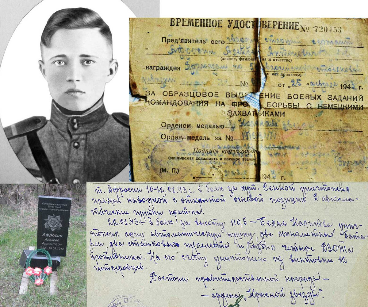 В результате долгих поисков, я узнал, что Алексей Афросин, с 1941 года воевал в составе Калининского (К северо западу от Москвы - Новая Русса), а затем юго-западного фронтов. Командуя орудием батареи 76 мм пушек, прошел битву под Сталинградом. В составе 5 ударной армии 54 гвардейской дивизии брал Суровикино, Белую Калитву, Луганск (Ворошиловоград), Донецк (Сталино), Иловайск, Макеевку. за что был награжден орденом «Красной Звезды».