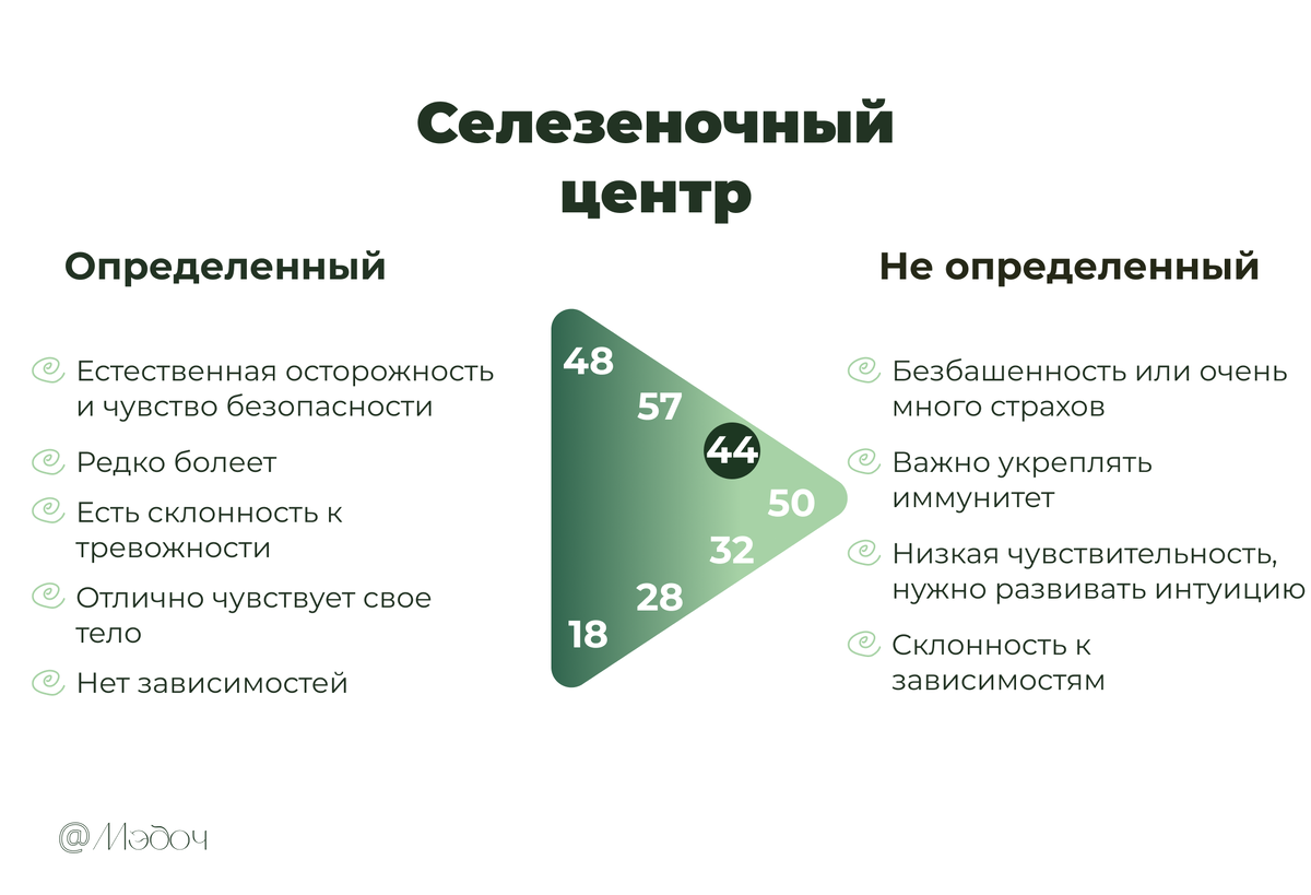 Селезенка соответствует чакре Муладхара в чакровой системе. Люди, у кого этот центр определен, обладают очень сильной чуйкой и интуицией, умеют буквально телом считывать пространство. Все, конечно, зависит еще и от каналов, которые здесь находятся. Если у вас определен канал 27-50, то воспитание и создание правил для выживания своего племени для вас будут на первом месте. Если у вас есть канал 10-57 - то у вас хорошая чуйка на прекрасное, вы умеете выживать, не жертвуя своей индивидуальностью. А канал 26-44 дает вам нюх на деньги и выгодные вложения. Также про Селезеночный центр могу сказать, что это место здоровья. Прокачивая этот центр, вы научитесь лучше чувствовать реакции своего организма на раздражители извне, улучшить здоровье на физическом уровне (я не исключаю здесь и медицинского вмешательства). Самое главное - научиться слышать и слушать себя, не обращая внимания на тех, кто пытается навязать вам свой образ жизни или интерпретацию ваших чувств. Все знания уже есть внутри.