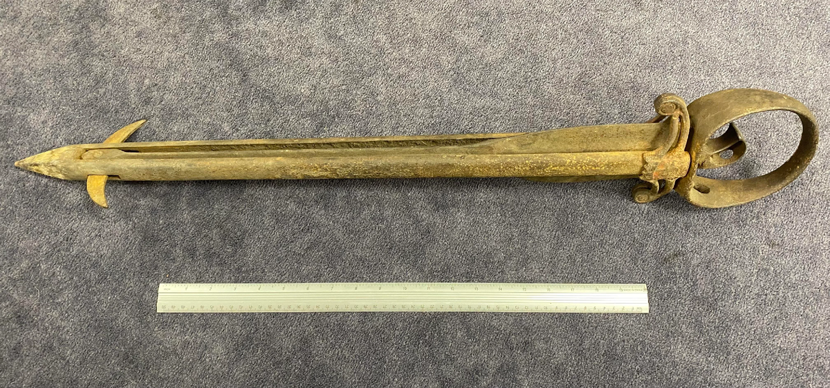 1. Старый тяжелый большой металлический кол/якорь с выдвижными штырями Старый тяжелый металлический кол/якорь с выдвижными штырями. На рукоятке есть курок, который отпускает штыри. Длина около 90 см с витиеватой ручкой и надписями, которые я не могу разобрать из-за коррозии. Предмет был найден в сарае после покупки дома. Это старое копье для сена. Иногда его называют гарпуном для сена. Возможно, это марка "Неллис". 2. Металлический инструмент, найденный недалеко с местом, где находился старый завод по производству стали. Это старый паяльник для свинца. 3. Длина этого инструмента составляет около 14 см. Возможно, он связан с электрикой, судя по тому, где он был найден. Это инструмент, используемый для соединения старого телефонного провода с плинтом. 4. Странная голубая штука с оранжевой крышкой. Выглядит как смятый патрон для игрушечного пистолета "Nerf". 5. Что это за штука? Насадка для паяльника для бутановой горелки Друзья, спасибо, что дочитали до конца!