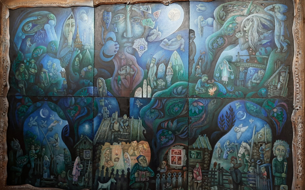 Вот мы проходим круглую часть здания – и перед нами небольшое помещение, похожее на мастерскую художника. Здесь расположились сокровенные кони. А напротив мастерской – автопортрет Фатхутдинова, в окружении духов и других образов его творчества.