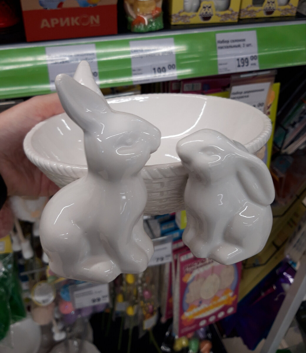 Всех тепло приветствую! До светлого праздника Пасхи чуть больше месяца. Есть время выбрать рецепт кулича, способ украшения яиц, продумать декор праздничного стола. Тем более в этом году Фикс Прайс привёз замечательную пасхальную коллекцию. 🐇 Керамическая тарелка "Кролики", 249 р. Тарелочка глубокая, по бокам имитация плетения. Украшают тарелку два крольчонка. 🥚 Тарелка для яиц пасхальная "Кролик", 249 р. Тарелочка из фарфора, углубления на 6 яиц, в центре - фигурка кролика. 🧂 Пасхальный набор солонок, 199 р. В наборе две солонки, выполнены из керамики. 🐰 Фигурка керамическая "Кролик", 149 р. Ничего лишнего - белый зайка с золотистыми ушками. В прошлом году на таких фигурках были цветочки. В этом году кролики максимально стильные и локоничные. 🌱 Жестяной поднос O'kitchen, 30x16 см, 79 р. Понравился нежно-салатовый, очень весенняя расцветка. 🐣 Гирлянда пасхальная, 174,50 р. Выполнена в виде деревянных фигурок. Есть зайчики и курочки. Светит гирлянда теплым светом, длина два ме
