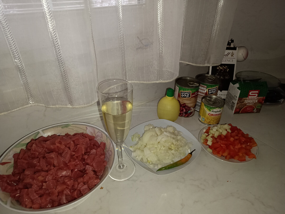 ЧИЛИ КОН КАРНЕ Данное блюдо прекрасно подходит для большой компании. Оно сытное, не хлопотное в приготовлении и его готовка занимает не так уж много времени. Зато подача оригинальна и вкус, что называется, с изюминкой. И так, приступим. Ингредиенты Бескостная говядина 800 г - 1.000 г Лук 150 - 170 г Болгарский перец 150 - 170 г Чеснок 2-3 зубчика 0.5 - 1 небольшой Чили перец или 0,5 - 1 чайная ложка сухого измельчённого Чили перца. Комментарий - это блюдо должно быть как минимум пикантным, но горячиться с перцем не стоит. Тот кто хочет, всегда может добавить перец, а вот убрать его из блюда уже невозможно Консервированная готовая фасоль в банках 300 - 400 г (без жидкости) Консервированная готовая кукуруза в банках 100 г (без жидкости) Белое сухое вино 60 - 80 мл. Томатное пюре (пасирте томатен) – 200 мл. Растительное масло - две столовые ложки Сливочное масло - 20 г Смесь специй - сушёный орегано - 2 чайные ложки, сушёный майоран - 1 чайная ложка,сухие семена тимьяна - 1 чайная ложка,