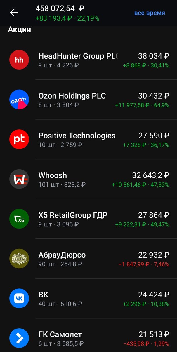 Как и обещал ранее хочу познакомить Вас с портфелем, который с начала года обгоняет индекс Мосбиржи в три раза (индекс вырос на 7.5%, а портфель 22.1%) Основные принципы при отборе компаний в портфель "Акции Роста": - ожидание редомициляции (перерегистрация компании с одной страны в другую с сохранением всех бизнес структур - сильные финансовые показатели и рыночные условия, благоприятные для отрасли в целом - бизнес компании должен быть сосредоточен внутри страны для минимального влияния на него санкций Портфель собран на 350 тыс. рублей. 📌 15 компаний с равными долями между собой. Инарктика тикер $AQUA Яндекс тикер $YNDX Тинькофф тикер $TCSG Whoosh тикер $WUSH Камаз тикер $KMAZ Астра тикер $ASTR Positive Technologies тикер $POSI Софтлайн тикер $SOFL HeadHunter тикер Group $HHRU Мать и дитя тикер $MDMG ВК тикер $VKCO Ozon Holdings PLC тикер $OZON Абрау-Дюрсо тикер $ABRD ГК Самолёт тикер $SMLT X5 RetailGroup ГДР тикер $FIVE 📌 Облигации М.Видео – защитный актив. Доля в пор
