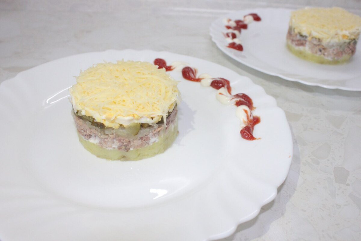 Ингредиенты: 1 картофелина, сваренная в мундире 1 банка печени трески 2 яйца, сваренных вкрутую 1-2 маринованных огурца 1 маленькая луковица 80 г сыра твёрдых сортов соль - по вкусу майонез для заправки Способ приготовления Шаг 1 Подготовить продукты. Яйца и картофель сварить до готовности, затем остудить и очистить. Очищенный картофель натереть на крупной тёрке. Шаг 2 Выложить натёртый картофель на дно салатников. Смазать майонезом. Шаг 2 Печень трески аккуратно слить жидкость. Затем вилкой размять печень, но не мелко. Выложить печень поверх картофеля. Шаг 3 Лук очистить и мелко нарезать. Выложить лук поверх печени трески, сделать сеточку из майонеза. Маринованные огурчики мелко нарезать и выложить на лук. Яйца, натертые на крупной тёрке, выложить поверх огурцов и сделать сеточку из майонеза. Сыр натереть на мелкой тёрке и выложить поверх салата пышной шапкой. Дать салату пропитаться 1-2 часа в прохладном месте, а затем подать к столу. Нежный, сытный, вкусный салат из печени трески