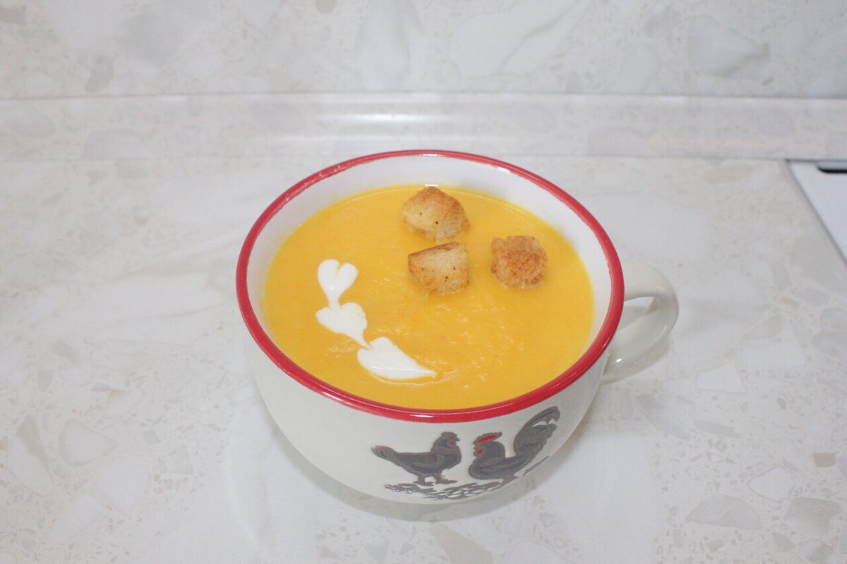 Ингредиенты: 1 картофелина 600 гр очищенной тыквы 1 морковь среднего размера 1/2 луковицы 20 гр растительного масла 150 мл сливок 4 слайса белого батона для гренок соль Перец 1/2 ст.ложки оливкового масла Способ приготовления Шаг 1 Картофелину и тыкву порежьте на кусочки размером 15х15х15мм. Залейте водой и поставьте вариться. Уровень воды должен быть на палец выше нарезанных овощей. Посолите по вкусу. Варите до готовности. Шаг 2 Спассируйте морковку и лук. Шаг 3 Пока готовятся овощи - приготовьте гренки. Нарежьте кубиком 10х10 батон. Сложите кусочки в пакет. Присолите нарезанный батон в пакете, поперчите, сбрызните оливковым маслом, все хорошо перемешайте. Выложите приправленные кусочки батона на пекарскую бумагу на противень. Выпекайте при 180 град. 10 мин. Шаг 4 Когда овощи сварятся, слейте отвар из кастрюли с овощами, оставив немного для того, чтобы было мягче измельчать. В тыкву добавьте спассированную морковку. Блендером измельчите в кастрюле тыкву с овощами. Доведите до кипения