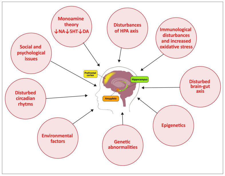 Депрессия - это психическое расстройство, развивающееся в результате сложных психоневрологических, иммуно-эндокринологических нарушений. Это заболевание сопровождается нарушениями настроения, постоянной грустью, потерей интереса и нарушениями когнитивных функций, что вызывает дистресс у пациента и существенно влияет на способность функционировать и иметь удовлетворяющую семейную, социальную и профессиональную жизнь. Патофизиология депрессии многофакторна, и лечение этого психического заболевания остается сложной задачей. В патогенезе депрессии задействовано множество причинных, взаимосвязанных факторов, как показано на рисунке ниже Депрессия требует комплексного лечения, включая фармакологическое. Поскольку фармакотерапия депрессии - это долгосрочный процесс, связанный с риском многочисленных побочных эффектов лекарств, большое внимание уделяется альтернативным методам терапии, включая фитофармакотерапию, особенно при лечении легкой или умеренной депрессии. Доклинические исследования