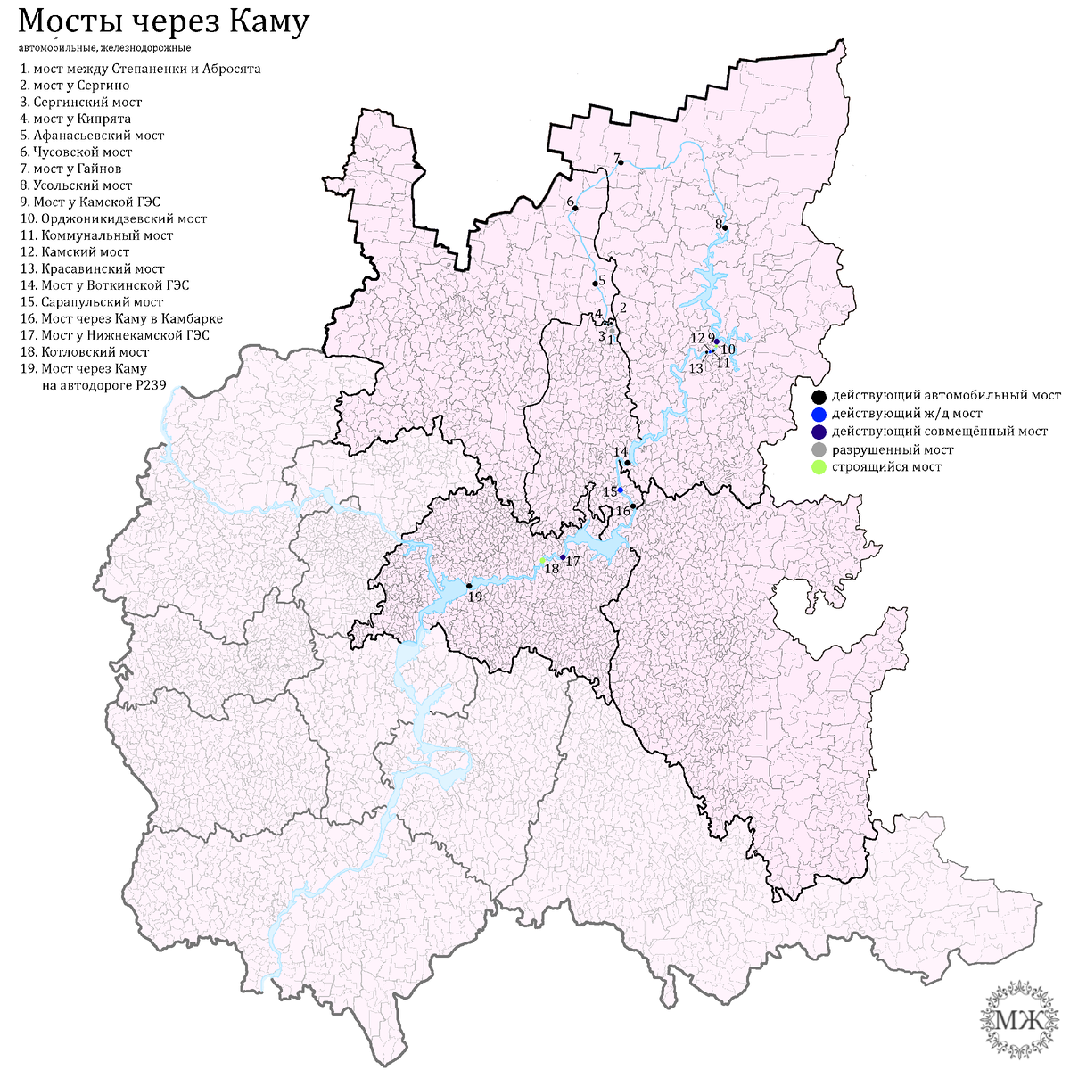 В этот раз всё просто, я не стал делить мосты на первый и второй порядок, т.к. их всего 3. Река не такая длинная и почти во всех местах потребность в мосте практически очевидна. Было 4, но меня чутка опередили, потому все три расположены исключительно в Пермском крае.
