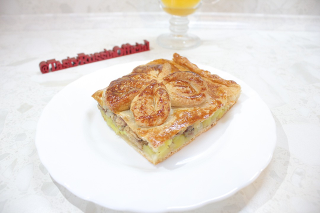 Ингредиенты: 500 гр слоенного теста 4 шт картошки 2 шт лук 1 банка рыбы Соль Перец Масло подсолнечное Как приготовить Шаг 1 Картошку режем на маленькие кубики, лук шинкуем мелко. К ним добавляем соль, перец, масло и хорошо перемешиваем. Шаг 2 Рыбу консервированную мнем вилкой до состояния кашицы Шаг 3 Тесто (2 пласта)раскатываем примерно 4-5 мм толщиной, один будет служить основой пирогу, второй будет его закрывать сверху. Шаг 4 Кладём тесто на противень застеленный пергаментом. Сверху кладём картофель с луком. Распределяем по тесту, оставляя края свободными примерно по 2 см. После кладём рыбу на картошку, тоже все распределяем. Шаг 5 Закрываем тестом сверху, защипываем края у пирога. Оставляем отверстие в центре примерно 8 мм. Шаг 6 Выпекаем при 190 гр 35 минут.