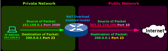 Перегруженный NAT это когда любой адрес в локальной сети в поле исходящий IP адрес IP-пакета заменяется на публичнй IP-адрес шлюза.