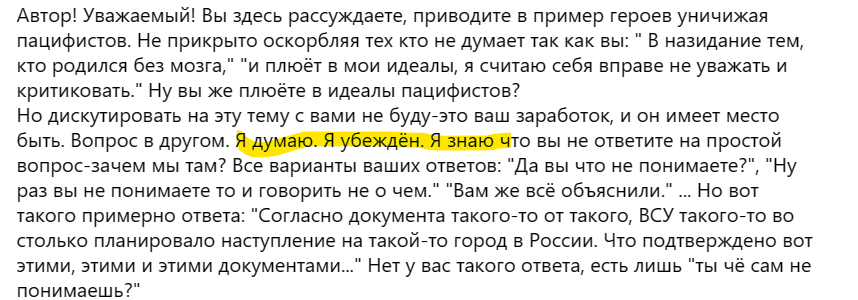 Не хотел я обратно о политике, но дурачки слетаются на ту же самую статью, которая "залетела", и среди однотипных комментариев, отправляющих меня в окоп (на которые я уже ответил, надеюсь, достаточно ясно), появился вот такой прекрасный неграмотный человек, который уверен в себе настолько, что ему даже не нужно дискутировать с собеседником - он отлично поговорил сам с собой: Я надеюсь, что на вопрос, сформулированный этим комментатором, может ответить любой из нас, разделяющих точку зрения наших властей. Предполагаю, что некоторые ответят крайне неудачно, легко став мишенью для высмеивания вот таким вот комментатором (или, вернее, его более умными сторонниками - у которых всё в порядке с логикой). Тем более, что примеры неудачных ответов у меня тоже есть: некоторые на полном серьёзе говорят о "возвращении наших исторических земель" - и вполне резонно становятся жертвами аналогии с одним несостоявшимся художником, который тоже возвращал Германии её, на его взгляд, исторические земли. Но