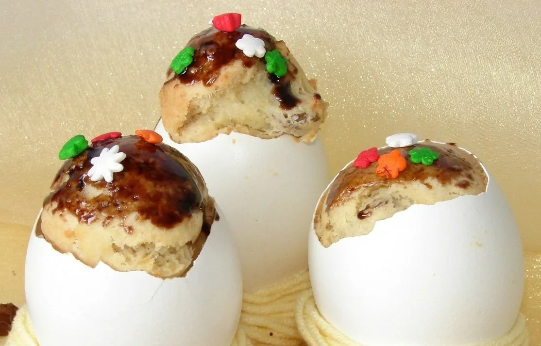 В форму для выпекания или противень насыпать соль (это делается для устойчивости куличиков), скорлупу аккуратно смазать любым жиром, выложить в нее на 1/3 тесто, установить в форму, накрыть полотенцем или затянуть пленкой, поставить в теплое место для поднятия. Затем я смазывала верхушечки взбитым яйцом и в духовку на 30-35 минут. В общем все так же, как и с обычными куличами. Немного остывшие куличики смазать глазурью и украсить по своему вкусу. Приятного апп