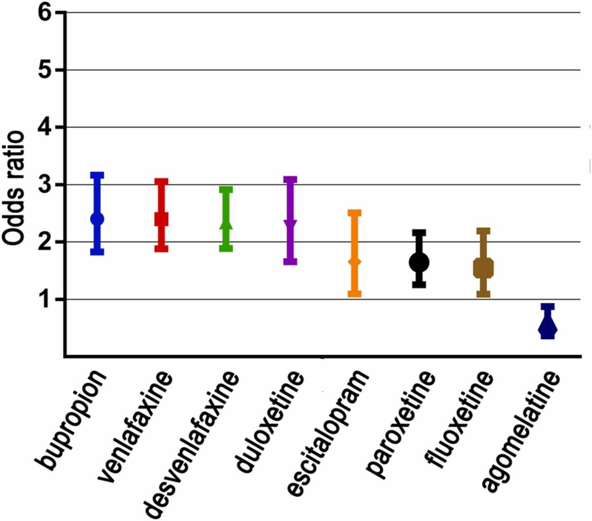Один антидепрессант агомелатина показал значительно более низкую частоту кратковременной бессонницы, чем плацебо. У шести из 14 исследованных антидепрессантов (циталопрам, вортиоксетин, флувоксамин, левомилнаципран, ребоксетин, сертралин) частота возникновения бессонницы была такой же, как у плацебо. На рисунке ниже показан обзор результатов. Исследование воронкообразных графиков не выявило признаков предвзятости публикаций.