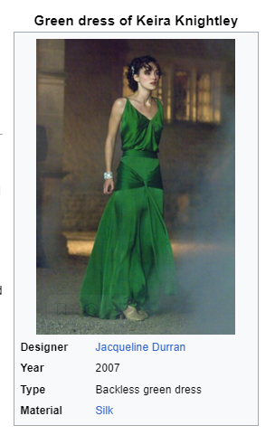 Кира Найтли носила зеленое платье, созданное Жаклин Дюрран в фильме "Искупление" 2007 года. С тех пор платье регулярно входит в список одних из самых лучших нарядов.