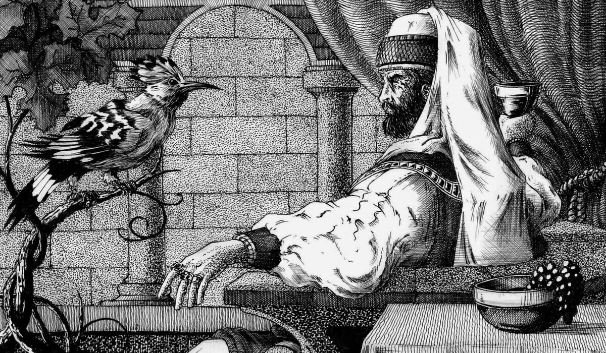 И вот однажды во время парада он заметил, что среди птиц есть свободное место через которое проглядывалось небо. Увидев в небе пустоту, Соломон (мир ему), спросил у птиц: "Кто отсутствует на параде? Чьё место пустует?"