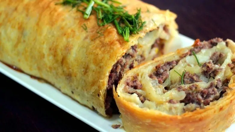 Штрудель из слоеного теста с мясом и картошкой: может стать полноценным обедом для всей семьи