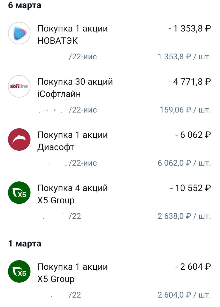 Решил делать отчёты в целом по инвестициям в фондовый рынок, а не просто по портфелю "Ракета". Во-первых так будет проще, будут учтены заблокированные активы и всё что есть на счетах. Во-вторых прочитал, что Дзен может принимать такие заголовки за кликбэйт и не показывать в ленте. В марте было нетипично для меня много покупок, связано это с тем что наконец я вышел из отпуска, начал получать зарплату, получил 13-ю зарплату, получил инвестиционный налоговый вычет. О вычете писал здесь: Покупки. Все средства от налогово вычета направил в фондовый рынок. Продаж в марте не было, только покупки. Итак, покупки по ИИС и брокерскому счёту в марте: Как всегда фаворит в моих покупках X5 group. Почему ритейлер мой фаворит можете прочитать в статье: Покупать X5 на ИИС я не могу, в связи с запретом ЦБ. Потому приходится покупать Пятёрочку на брокерский счёт, такая же ситуация и с акциями Озона. Остальное было куплено на ИИС. Заблокированные "красавцы" моего портфеля. В портфеле три заблокированные п