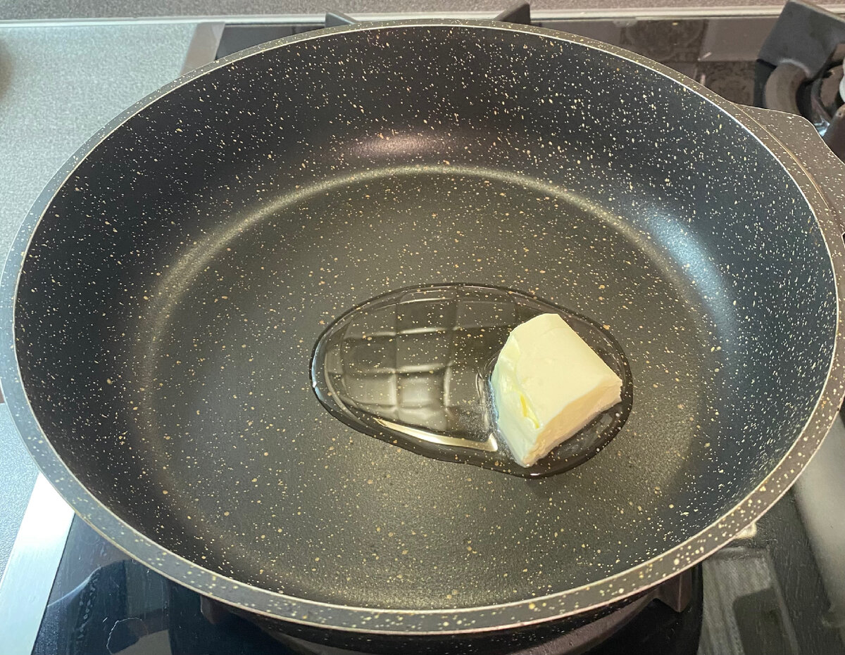 Первым делом разогреваем сковороду, добавляем немного растительного и кусочек сливочного масла.